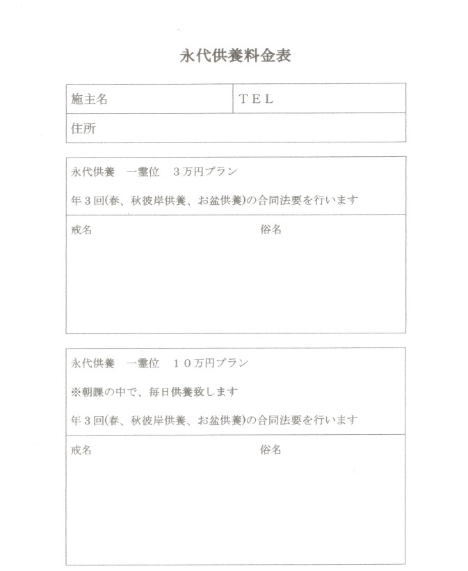 | 年3回+毎日供養 | 年3回の春、秋彼岸、お盆供養の合同法要に加えて、朝課の中で、毎日供養を実施 | 10万円/一霊位 |